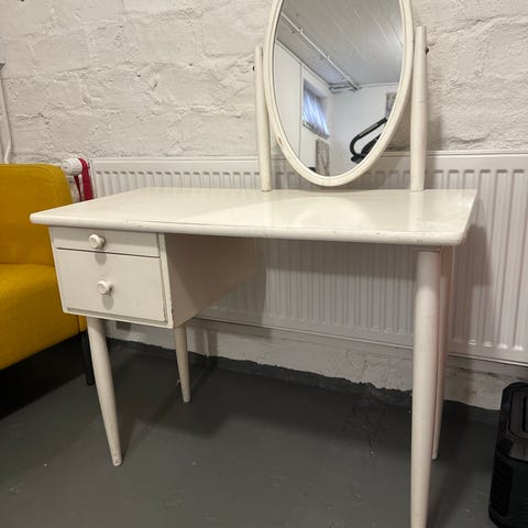 Esim. työ- tai meikkipöydäksi soveltuva laatikollinen pöytä. Pöytätasossa kulumaa, mutta esim dc-fixillä voisi saada kuntoon. Pöydän alla säilytystaso.