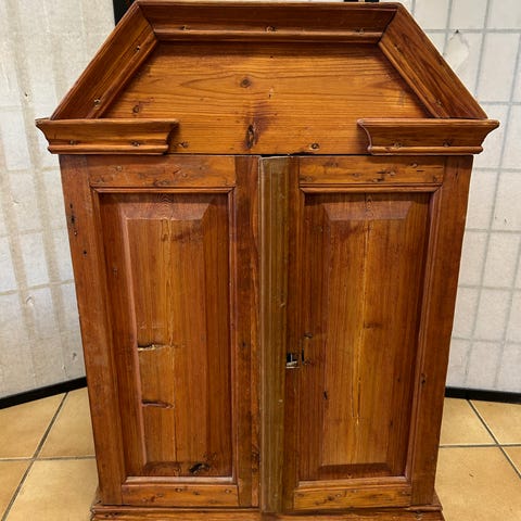 Leveys 51 cm, edestä korkeimmalta kohdalta 74 cm, syvyys 28 cm.