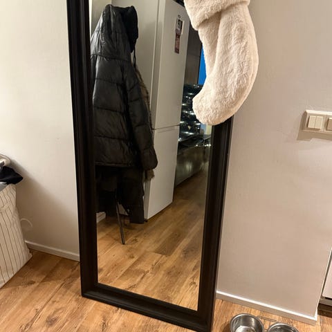 Myydään musta peili uniikeilla ”nahkaisilla” kiinnikkeillä. Alhaalla kaksi porareikää, joista ollut kiinni seinässä.