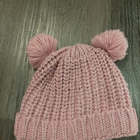 Lasten punainen/tummapinkki neulottu pipo, jossa on tupsu päällä. Lanka heijastinlankaa. Fleecevuori sisäpuolella. Käytetty hyvin vähän ja pesty kerran