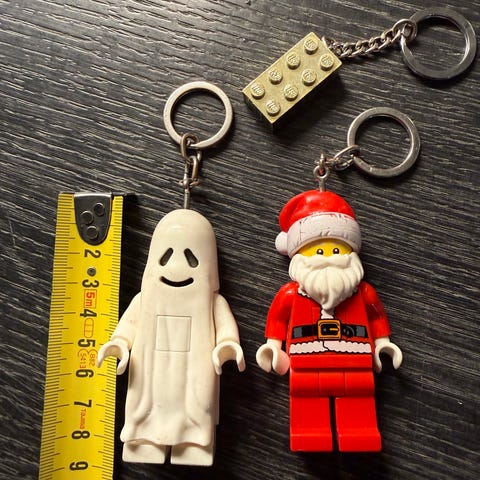 Lego-ukkeli-avaimenperä valolla, siisti ja ehjä, toimii. Tämä on isompi kuin tavalliset Legot, korkeus noin 7cm.