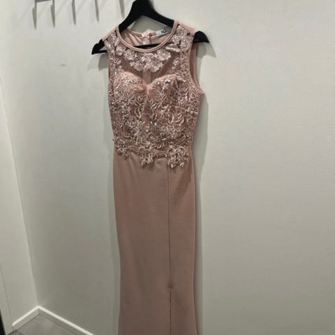 Ilta- tai juhlapuku beige värissä, koko 34 naisille. Puvussa on pitsiyläosa ja helmaosa, joka on valmistettu kevyestä ja laskeutuvasta materiaalista. Takana on avonainen selkäosa, joka voidaan peittää mukana tulevalla huivilla tai kietaisulla. Sopii juhla- ja iltatilaisuuksiin. Hp. 50 e.