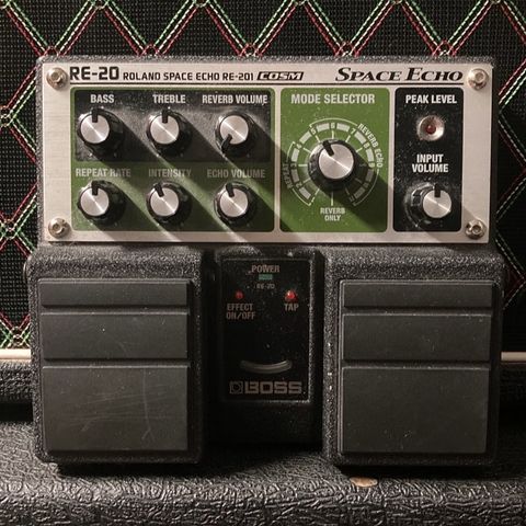 Boss RE-20 Space Echo on Bossin ja Rolandin yhteistyönä kehitetty Rolandin Space Echo 201 pedaalimuodossa. Pedaalissa on jonkun verran käytön tuomaa kulumaa, mutta se toimii moitteettomasti ja soundi on tietenkin erinomainen. Vaihdossa ehkä joku pikkuvahvari, nuppi tai kombo tai joku halvemman pään kitara esim. Danelectro.