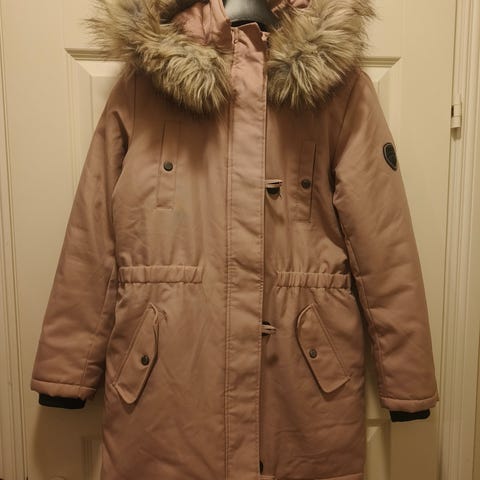 ONLY Talvitakki beige väri, koko M, naisten malli. Takki on toppaustyyppinen ja siinä on irrotettava hupun reunus, joka on koristeltu keinokarvalla. Takissa on vetoketjulla suljettava etuosa ja kaksi vetoketjutaskua etupuolella. Materiaali on kevyt ja lämmin, soveltuu kylmiin säihin.
