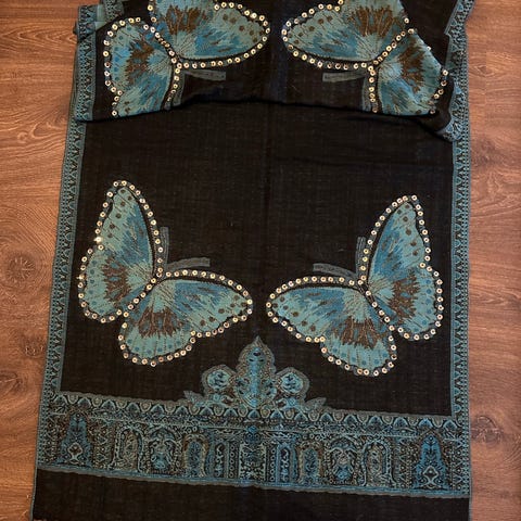 Uusi huivi (kuva ei anna oikeutta). Ei mikään Kiinasta tilattu. 50% pashmina 50% silkki. Rusk/kelta/kulta. Savusteeton ja hajuton koirakoti Ikuri/Tesoma