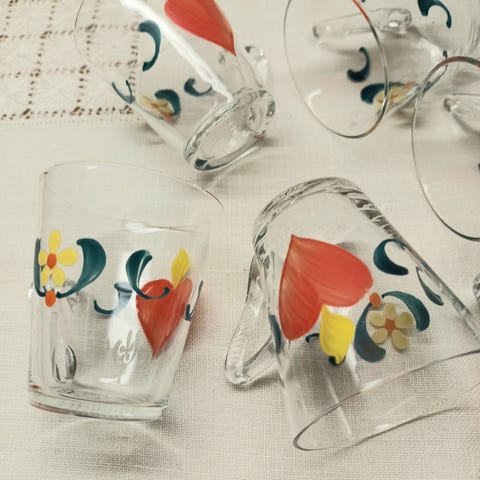 Punaista lasia,olisko martini lasit tai jälkiruokakipot. vanhat jo. yhdessä särö reunassa,3kpl. kork noin 9,5cm. nouto.