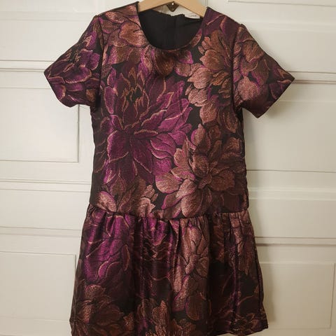 Tästä upea juhlamekko jouluksi tai uudeksi vuodeksi. Musta mekko kimaltelevilla paljeteilla. Ei pääse ihan oikeuksiinsa valokuvassa. Helma takapuolella on hieman pidempi kuin edessä. Koko 128.