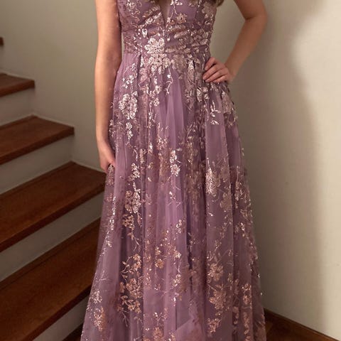 Vaaleanpunainen vanhojentanssimekko, koko XS. Kevyt ja laskeutuva kangas, läpikuultavat hihat ja pehmeä vyötärönauha. Hienovarainen halkio tekee lookista naisellisen. Käytetty kerran ja erinomaisessa kunnossa.