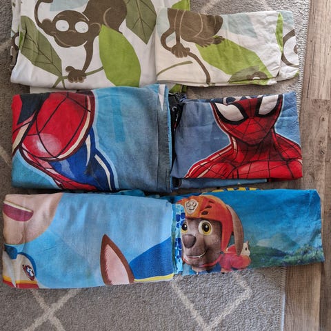 Juniorikokoinen pussilakana ja tyynyliina, "Maailman vahvin nalle"/ Bamse-kuosilla.