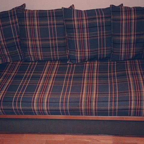 Antiikkinen 2-istuttava sohva, jossa on ruskea samettiverhoilu ja puinen runko. Sohvassa on napitettu selkänoja ja koristeelliset puiset käsinojat. Vaatii korjausta, kuten uudellee verhoilua