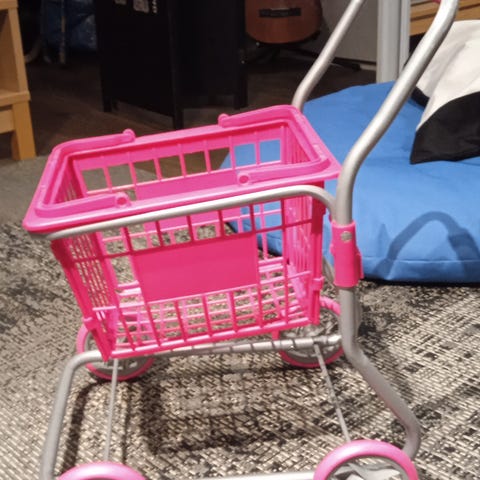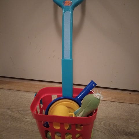 Hyväkuntoiset lelut, ostoskärry, leikkuri ja pienituoli myydään pakettina.