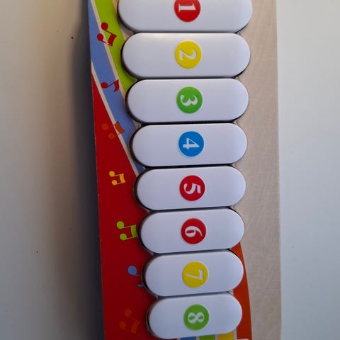 Pyöreä lelu, mistä saa hyvin kiinni, se helisee ja erilaisia paloja voi liikutella. Toisessa päädyssä peili.