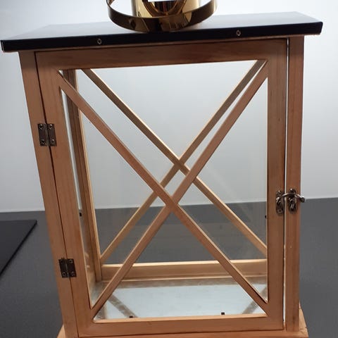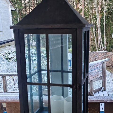 Myydään lyhty korkeus 39cm. Puu/metalli. Ollut sisätiloissa ja lasitetulla parvekkeella.
