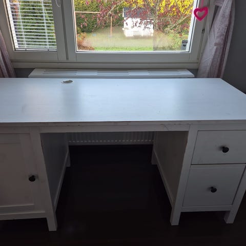 Vitt skrivbord från Ikea, finns små spår av användning vet inte om man kan tvätta bort dem.
