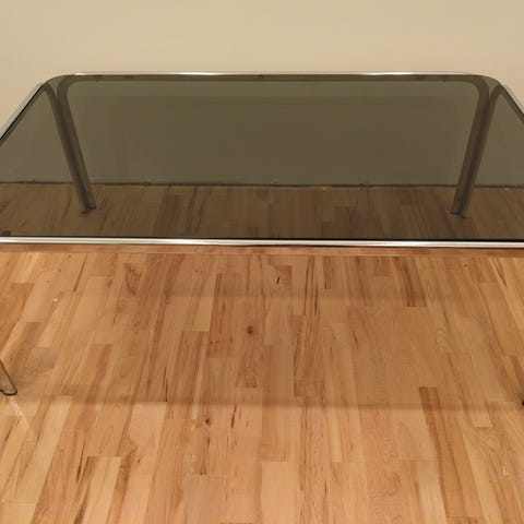 Myynnissä näyttävä ja kaunis 1970-80 luvun lasipöytä. Pöydän reunat on fasettihiottu. Toisen jalan liimaus on irronnut, siitä huolimatta jalka pysyy paikoillaan. Bukovskilla myynnissä samanlainen ruokapöytänä.