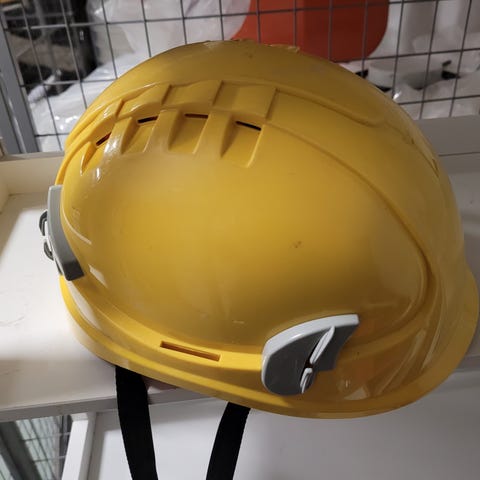 Keltainen suojakypärä, jossa on säädettävä hihna ja sisäinen tuki. Kypärä soveltuu suojaamaan päätä erilaisissa työympäristöissä ja aktiviteeteissa. Materiaali on kova muovi, joka tarjoaa suojaa iskuilta ja putoavilta esineiltä. Tarjoa!
