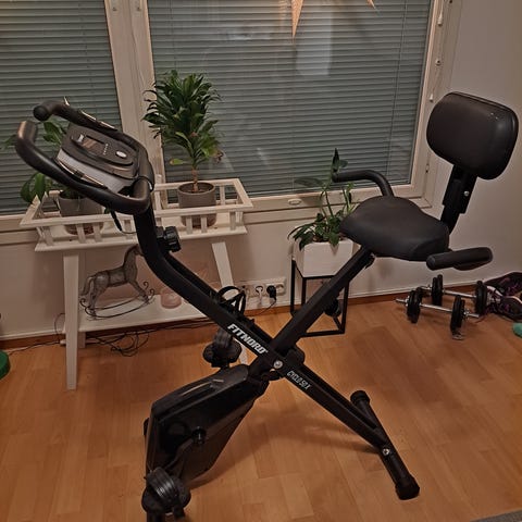 Käyttämätön kuntopyörä jossa selkänoja.