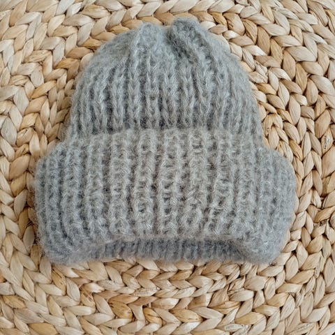 Rakkaudella itse neulottu haaleanharmaa naisten yhden koon silkki-alpakka pipo, malli 1 (erona malliin 2 tässä päälaki sileää neulosta).