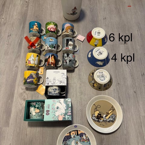 Tarrattomia muumiastioita, myyn itseltä tuplat pois. Ollut pääasiassa vitriinissä, juhlapyhinä satunnaisessa käytössä. Kaikki virheettömiä astioita. Lisäkuvia saa pyydettäessä.