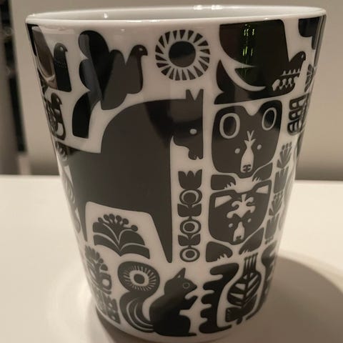 Myydään Marimekko muki, jossa Sanna Annukan Kanteleen kutsu -kuvitus. Mukin vetoisuus on 2,5 dl, halkaisija noin 7,5 cm ja korkeus noin 9 cm. Mukin kunto on moitteeton (ei naarmuja tms. käytön jälkeä).