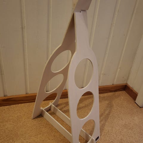 Linjakas metallinen viinipulloteline kuudelle pullolle. Korkeutta noin 40 cm.