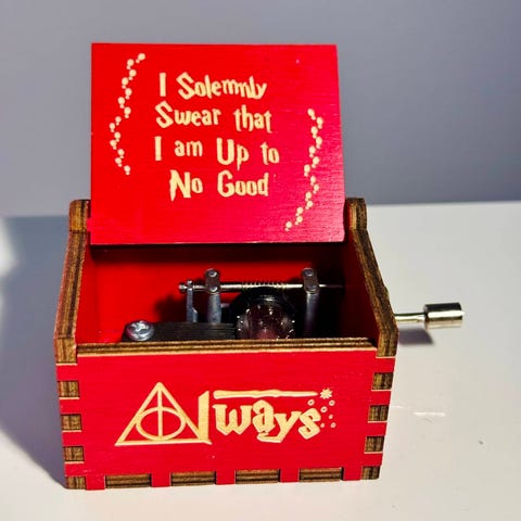 Koe Tylypahkan taika tällä lumoavalla vihreällä soittorasialla. Se on valmistettu vihreäksi petsatusta, laserkaiverretusta puusta ja on täynnä yksityiskohtia: kannessa on "Harry Potter" -logo, etupuolella Kuoleman varjelusten symboli koskettavalla "Always"-sanalla ja sivussa Tylypahkan vaakuna. Avaa kansi paljastaaksesi kuuluisan Kelmien kartta -lainauksen: "I Solemnly Swear that I am Up to No Good". Käännä vain pientä mekaanista kampea soittaaksesi ikonisen "Hedwig's Themen". Tämä paristoton muistoesine on täydellinen lahja jokaiselle velhomaailman fanille. 6.4*5.2*4.2cm