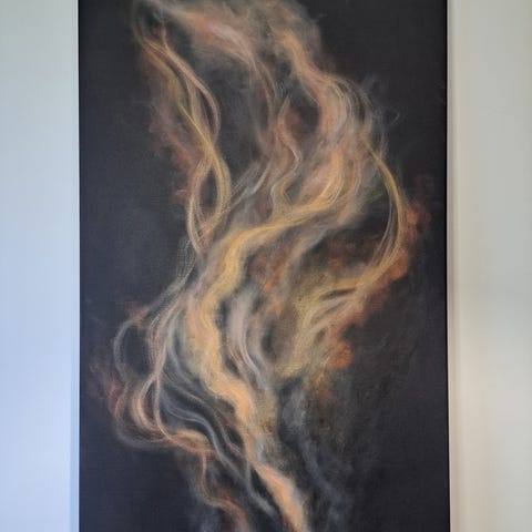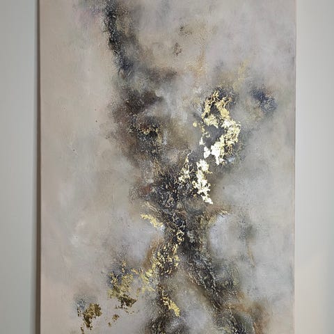 Abstrakti maalaus, jossa käytetty rauhallisia harmaan, ruskean, beigen, sekä hieman harmaanvihreän sekä vaaleanpunaisen sävyjä. Soveltuu monenlaisiin tiloihin.