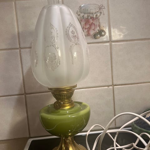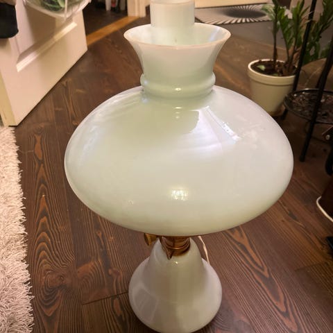 Pöytälamppu, korkeus n 40cm, alaosa valkoista lasia maalauksilla, uusi sukka, liekkilasi ehjä ja muutenkin ehjä ja siisti