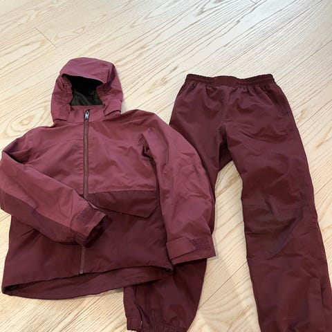 Catmandoo lasten talvitakki ja housut, sininen, koko 120-130cm (naulakkolenkissä lukee 120). Housuissa on säädettävät olkaimet ja vyötärön kiristys.
