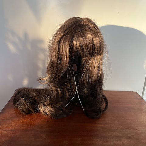 Myydään tummanruskea ja pitkä kuituhiusperuukki otsatukalla, synteettistä materiaalia. Pituus päälaelta pisimpään hiussuortuvaan noin 54 cm. Hiuksia voi halutessaan lyhentää haluamaansa pituuteen. Tukassa luonnollisen näköinen siksak-jakaus. Peruukki sopii useaan päähän, sillä siinä on säädettävät lenkit, joilla säätää kireyttä sekä istuvuutta.