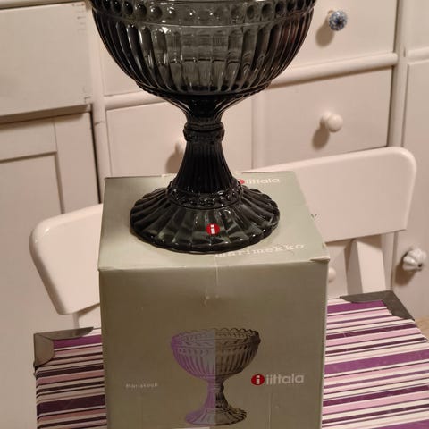 Iittala Mariskooli, luumu / Plum red, 155 mm Iittala-tarra paikoillaan ja Marimekko-teksti kaiverrettu pohjaan. Erittäin hyvä kunto. Takaan turvallisen pakkauksen lähetyksessä. Nouto Helsingistä (00380) on myös mahdollinen.