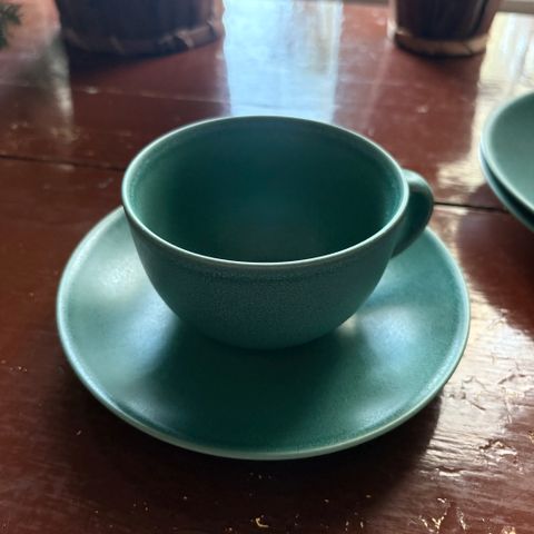 Arabia 24 h vihreät teekupit, joiden kunto uudenveroinen, sekä aluslautaset, joiden väri hieman vaaleampi/haalistuneempi kuin kuppien, aluslautasia siis käytetty jonkin verran mutta kuppeja vain pari kertaa. Sopii lahjaksi!