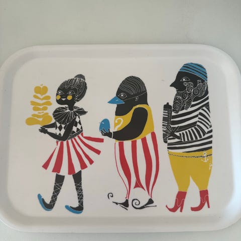 Metsänväki-kuosilla pieni Marimekon tarjotin. Ei enää saa mistään uutena.