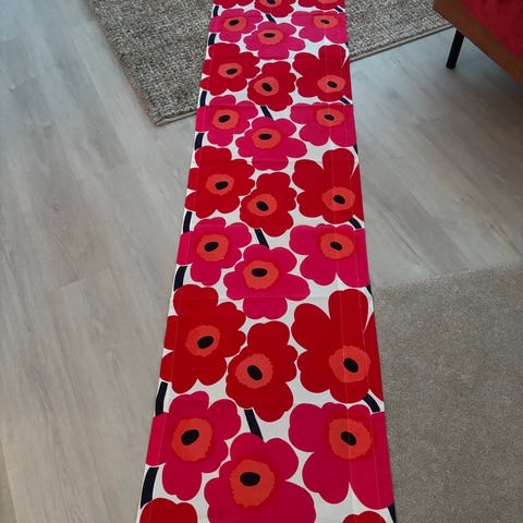Marimekko kappaverho keltaharmaa, ikkunaruudun osalta haalistunut.