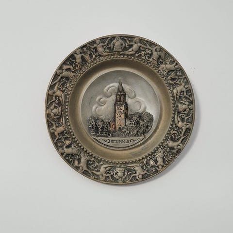 Itämainen seinälautanen, tehty käsityönä Turkissa. Lautasen halkaisija 32cm, takaa löytyy kiinnitysreikä narua varten. Pinnoitteessa jonkin verran kulumaa, mikä ei tosin näy hyvin.
