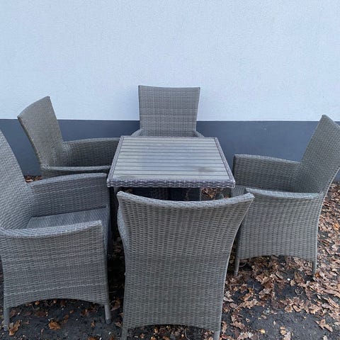 Parvekkeella ollut. Pieni jälki divaani osan pehmusteessa, mutta saa käännettyä piiloon. Muuten hyvässä kunnossa. Väri ero tyynyssä ei näy kun kääntää toisinpäin. Aurinko haalistunut toisilta puolilta.