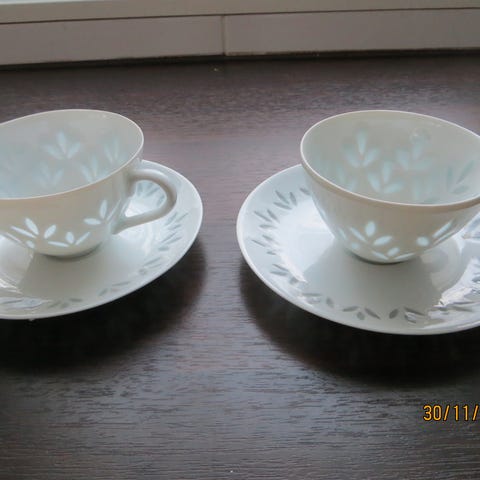 Vanhemmat ja hienokuntoiset Arabia riisiposliini mokkakupit ja asetit 12kpl, ei lohkeamia tai halkeamia, olleet vain koristeena vitriinissä, Friedl Holzer-Kjellbergin lehti koriste, pohjassa vanhempi ARABIA, FHK, Made in Finland. Kupit: kork. 4 x halk. 7cm asetti/ tassi halk. 11cm, 15e per setti, johon kuuluu kuppi ja asetti