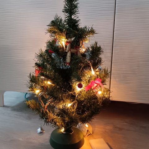Valkoinen puinen kuusi pastellitähdellä. Hp8e