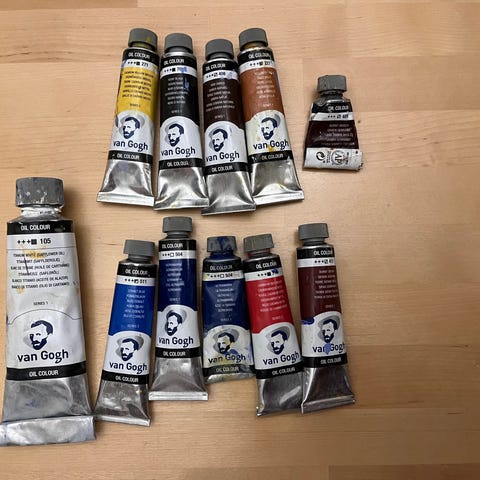 Beckers 150ml, Van Gogh 40ml, eri värejä, viridian vihreä, kadmium keltainen ja kadmium punainen, sitruunan keltainen, alizarin punainen, ultramariini sininen ja koboltin sininen. Iso tuubi Beckers 150ml maksaa 9€ ja Van Gogh 40ml 4€kpl.