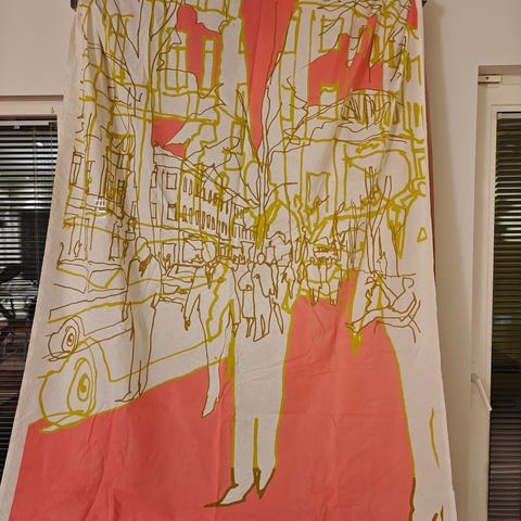 Myydään Marimekon Hetkiä sisustuskangas, ohutta puuvillaa, väri musta/valkoinen. Leveys 160cm, korkeus 260cm.