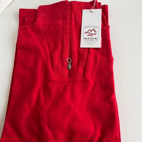 Musta Mäser poolopaita. Edessä kauluksessa vetoketju. 100% puuvillaa. Kokomerkintä 36. On aika napakka, joten menee mielestäni paremmin jos on kokoa 34.
