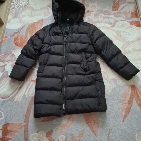 Musta, lämmin toppatakki. Ehjä ja siisti. Takissa on edessä sivuilla vetoketjulliset taskut. Vasemmassa hihassa kaksi taskua – läpällinen ja vetoketjullinen. Takkia siis mahdollista käyttää myös laskettelutakkina. Hihansuissa lumilukot ja hihansuun kireyttä on mahdollista säätää. Hupun saa tarvittaessa irrotettua, kiinnitys kaulukseen neppareilla. Hupussa turvallisuutta lisäävä heijastinosa.