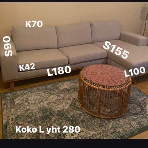 Myydään harmaa Sotkan Artic-kulmasohva, jossa molemmat päät yhtä pitkät (264cm käsinojan reunasta nurkkaan). Sohva rakentuu kolmesta osasta, kaksi pitkää sivua ja kulmapala. Jalat vaalea tammi.