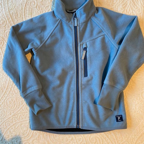 Polarn O. Pyret Softshell-takki, koko 116. Takissa on vetoketjukiinnitys ja huppu. Valmistettu materiaalista, joka tarjoaa suojaa tuulelta ja kevyeltä sateelta.