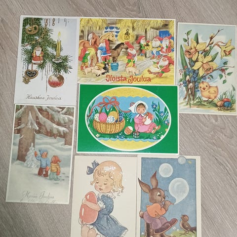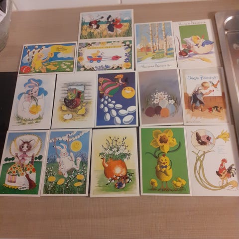 Kokoelma vanhoja kiertäneitä pääsiäiskortteja, joissa erilaisia pääsiäisteemaisia kuvia kuten tipuja, kukkia ja eläimiä. Vanhimmat vuodelta 1943.