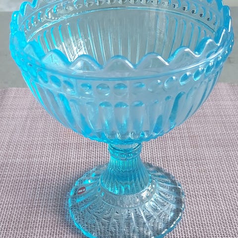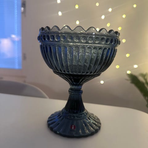 Iittala Mariskooli tarjoiluun, siniharmaa lasimateriaali. Kulho on suunniteltu tarjoiluun ja jälkiruokien esillepanoon. Mallissa on koristeellinen reuna ja jalallinen muotoilu.