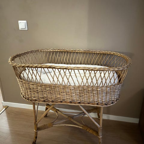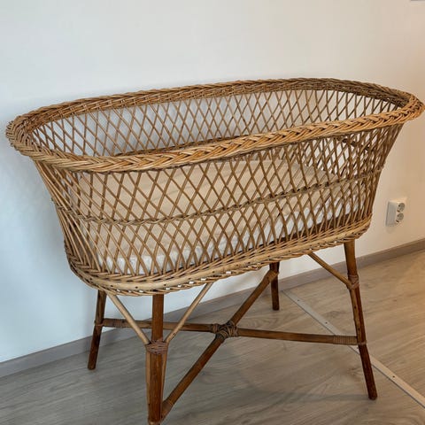 Rottinkinen vauvan kehto, jonka mukana tulee mittatilauksena teetetty patja, patjan suojus sekä kaksi lakanaa.