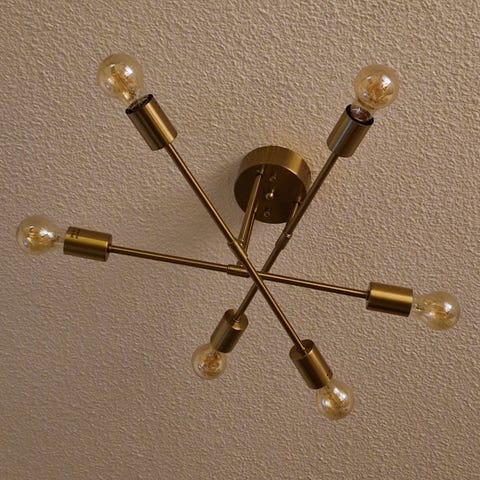 Kultaisen sävyinen kattovalaisin. Pistokeliitäntä. Ostettu vuosi sitten, ei enää sovi sisustukseen. Polttimot kuuluu kauppaan. Uudenveroinen.