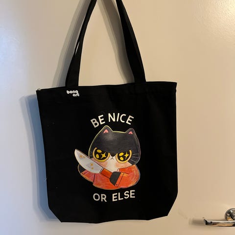 Emily McDowellin jämäkkä kangaskassi / totebag / shopper (millä nimellä näitä oikein nykyään kutsutaan?! 😅). You Should See My Active Bitch Face -painatus on yhdellä puolella kassia. Kassin materiaali on paksua ja hyvin tukevaa puuvillacanvasta, ja ompelujälki on siistiä ja huoliteltua niin kassin sisä- kuin ulkopuolella. Tässä kassissa on melko pitkät olkahihnat eli sopii olalla kannettavaksikin. Kassissa on leveä pohjakappale, mikä tekee tästä mukavan tilavan. Sopii myös nasevaksi projektipussiksi esim. isommalle neule- tai virkkaustyölle lankakerineen 😉