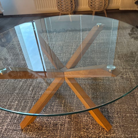 Tiffany sohvapöytään kuuluu kaksi osaa, jotka menevät sisäkkäin (kuvassa). Päälimmäinen muotoiltu pöytä (mitat annettu ilmoituksessa: korkeus 52, leveys 120, syvyys 80) ja pienempi alapöytä pyöreä halkaisija 40, korkeus 40). Alapöydän reunassa pieni huomaamaton lohkeama. Jalat punaruskeaa puuta, messinkikiinnitys lasiin. Pöydät nyt purettuna paketissa.